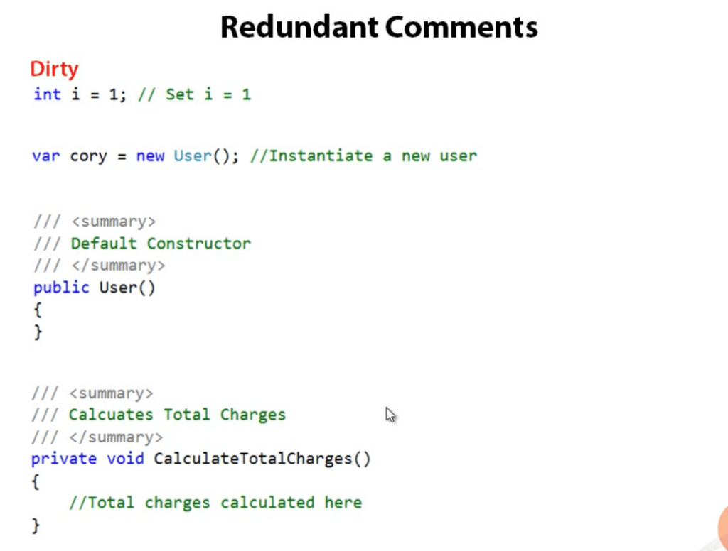 - Avoid redundant comments. This breaks the DRY principle. You should assume that your reader can read code, as to not require comments for things that may be obvious.